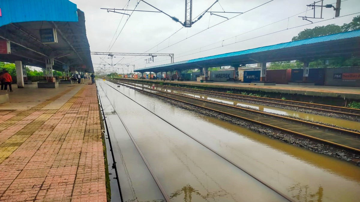 #WATCH | Mumbai, Maharashtra: Waterlogged railway tracks between Wadala and GTB stations.